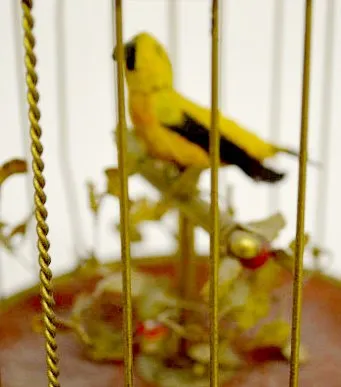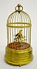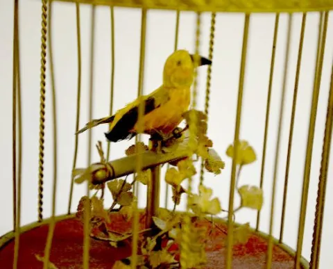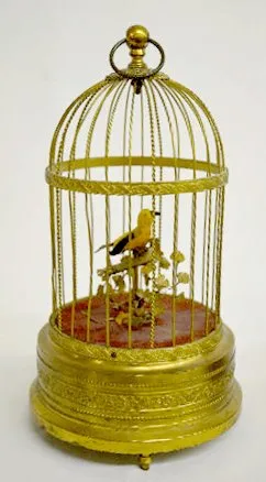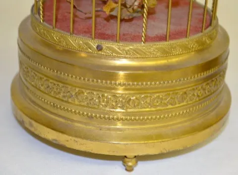 Antique Automated Bird in Musical Cage The rounded top cage has pressed brass floral designs around it and the base. The orange and black bird, sitting on a brass perch, sings and moves it's head while singing. The musical cage is working at this time. (The cage needs to be cleaned.) 11 1/4" Tall, excluding the ring handle.