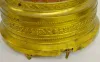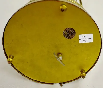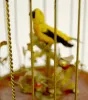 The rounded top cage has pressed brass floral designs around it and the base. The orange and black bird, sitting on a brass perch, sings and moves it's head while singing. The musical cage is working at this time. (The cage needs to be cleaned.) 11 1/4" Tall, excluding the ring handle.