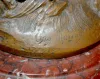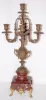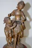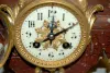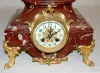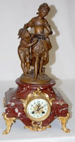 The bell striking movement is No. 5440. "NORA" is on the enamel dial. There is another non-legible name below the center decoration. August Moreau designed the figure on top - a young woman and a boy with a bird cage. They and the 5 cup candelabra side pieces are on dark maroon colored marble with white spots and streaks. The clock is running and striking at this time. Dial 3 1/2" Diameter; Clock 19 3/4" Tall x 10 3/4" Wide; Side pieces with removable snuffers are 22 1/4" Tall
