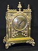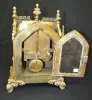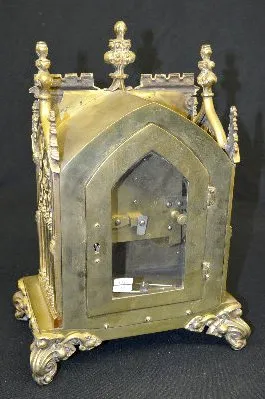 Antique French Gothic Shelf Clock With an unmarked TO movement in an all brass and glass case with the pendulum, the key and the key to the back door. Not tested. (We could not get the front door open to test the clock.) 15 3/4" Tall.