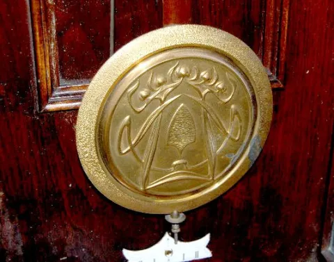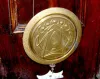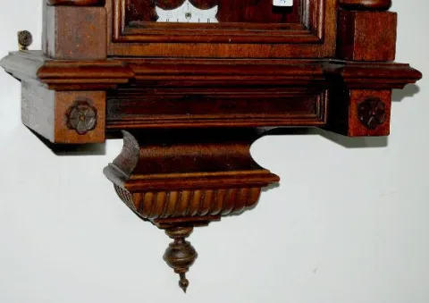 The center of the dial, the pendulum ball and the 2 weights have matching stylized designs. In an ornate carved mahogany veneered case with a carved crest. Not tested. (The case has a few minor scuffs and some worm holes. There are some dents to the dial surround and the weights. The lower finials are missing.) Dial - 6 1/2" Diameter; Case - 52 1/2" Long.