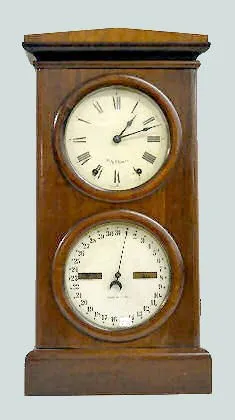 Seth Thomas "Parlor Calendar No. 3" Clock In a walnut veneered case with an 8 day spring strike movement; a painted metal upper dial marked "Seth Thomas" and a painted metal lower dial marked "Patented". (The clock is not running at this time.) 27" Tall