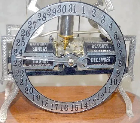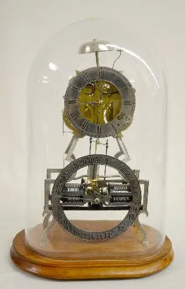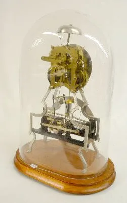 Contemporary Dome Calendar Clock Unmarked with an 8 day T&S movement; a silvered metal dial with raised numbers and the pendulum. (The clock runs but does not strike.) Clock - 18" Tall; With dome - 20" Tall