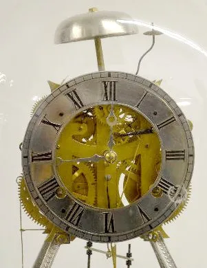 Unmarked with an 8 day T&S movement; a silvered metal dial with raised numbers and the pendulum. (The clock runs but does not strike.) Clock - 18" Tall; With dome - 20" Tall