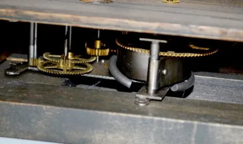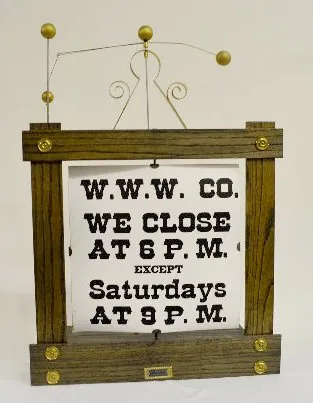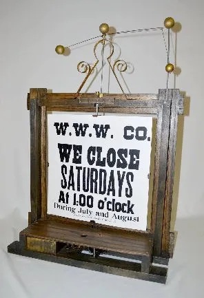 In a wood frame with a swing ball on the top and a turning advertising sign. This item has been restored by Dick Broline, the owner. Working at this time. 29" Tall