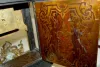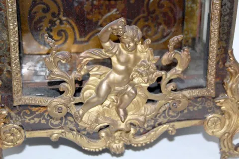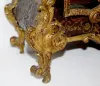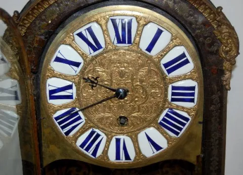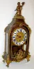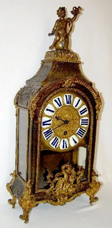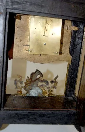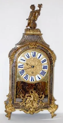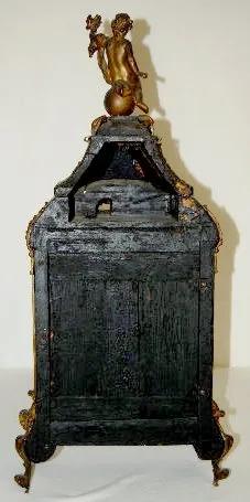 TO with individual porcelain Roman Numerals on a hand chased gilt metal dial. The very intricate designs include human heads, acanthus leaves, tassels and scroll work. Inside the clock's floor there are brass squares spaced on it - giving the floor a Tunbridge look. The inside of the back door is, brass lined with delicate cut outs, leaving a nice pattern. The movement is devoid of any marks. The pillars connecting the front and back plates are of an early style. The cut out metal designs on the case are mostly intact. There is a bronze figure on the top of the case and on the door. The spring winds OK. (There is no pendulum. The tortoise shell on the case is mostly gone. The gilt finish on the bronze figure on the top and the door is worn.) This clock needs some love and attention to restore it to its' former glory. 27 1/2" Tall x 13" Wide