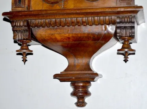 With an 8 day T&S movement; an unmarked porcelain dial; the 3 weights and the pendulum. Not tested. (The wood on the lower portion of the door is cracked. There are worm holes in the case. The lower case shows some wood damage.) 49" Long - 40" Long without the crest and finial.