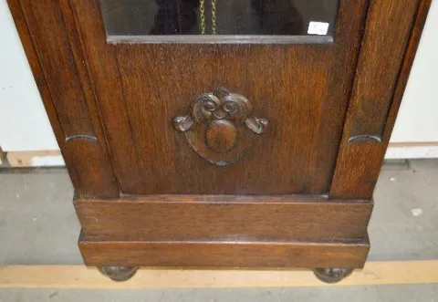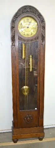 metal dial; has 2 weights and pendulum; carved case. Not tested. 78" Tall