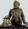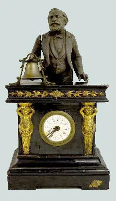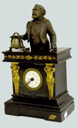 French Bell Ringer Statue Alarm Clock Unmarked with a set key wind movement; a porcelain dial and an alarm arm. The man rings a bell with his right arm when the alarm hits the set time. The clock is running and ringing at this time. 14 3/4" Tall (There are some small losses to the case.)