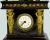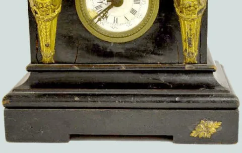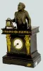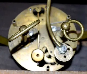 Unmarked with a set key wind movement; a porcelain dial and an alarm arm. The man rings a bell with his right arm when the alarm hits the set time. The clock is running and ringing at this time. 14 3/4" Tall (There are some small losses to the case.)