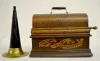 cylinder player; nice oak case with stenciling; in working and running condition; has crank and original black horn. Sounds good. Body 16" W x 9" plus...