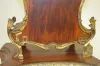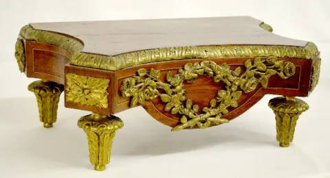 Marti Mahogany Mantel Clock and Base With 1/2 hour gong strike movement, No. 2774. The case, which is framed in metal decorations, is topped with a painted porcelain finial. The box it sits on has large bronze feet, rose vines and other applied decorations. The clock is running and striking at this time. (The dial is fractured.) Dial - 7 1/4" Diameter; Case - 26" Tall x 13" Wide; Base - 6 3/4" Tall