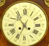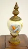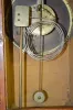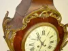 With 1/2 hour gong strike movement, No. 2774. The case, which is framed in metal decorations, is topped with a painted porcelain finial. The box it sits on has large bronze feet, rose vines and other applied decorations. The clock is running and striking at this time. (The dial is fractured.) Dial - 7 1/4" Diameter; Case - 26" Tall x 13" Wide; Base - 6 3/4" Tall