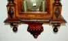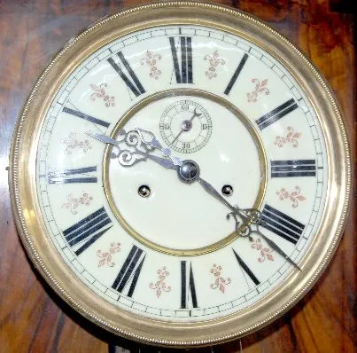 T & S; unmarked decorated porcelain dial with seconds bit; shell carved crest; carved side posts and bottom; glass sides; burled walnut front. 58" T
