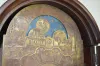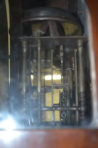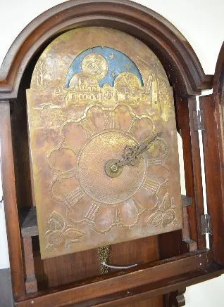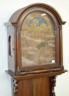 With an anchor or recoil escapement movement and an alarm. Two hammers are used on the one bell for striking the time and the alarm. The pressed brass dial has a pomegranate in the lower corners. Above the dial is a scene with a windmill, buildings plus moon phase. In a rosewood and veneered case. These clocks are sometimes referred to as Dutch Hoods. They were also made in surrounding countries and can date anywhere up to the 1870's. Not tested. (The applied decoration over the lower window is missing. The dial has darkened.) Dial - 9"; Case - 53" Long