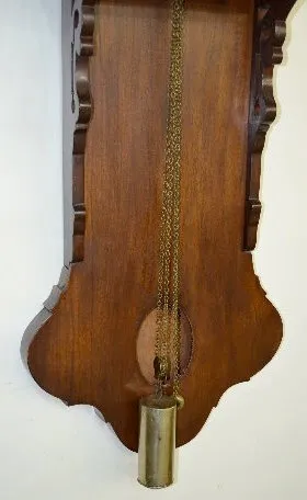 Dutch Hood Domestic Hanging Clock With an anchor or recoil escapement movement and an alarm. Two hammers are used on the one bell for striking the time and the alarm. The pressed brass dial has a pomegranate in the lower corners. Above the dial is a scene with a windmill, buildings plus moon phase. In a rosewood and veneered case. These clocks are sometimes referred to as Dutch Hoods. They were also made in surrounding countries and can date anywhere up to the 1870's. Not tested. (The applied decoration over the lower window is missing. The dial has darkened.) Dial - 9"; Case - 53" Long