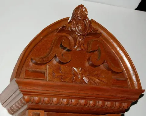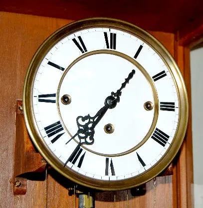 3 Weight Vienna Wall Clock In a carved case with a 2 piece porcelain dial and brass trim, pendulum and weights. Not tested Case - 64" Long