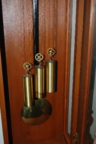 In a carved case with a 2 piece porcelain dial and brass trim, pendulum and weights. Not tested Case - 64" Long