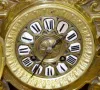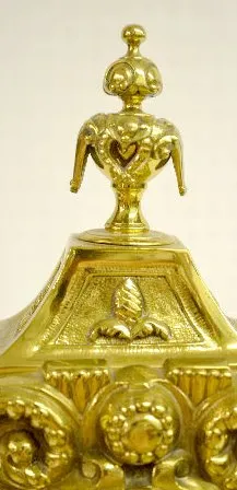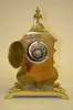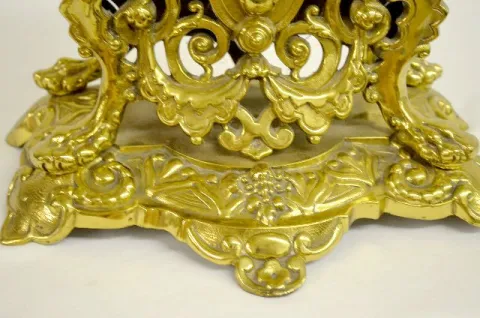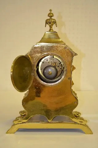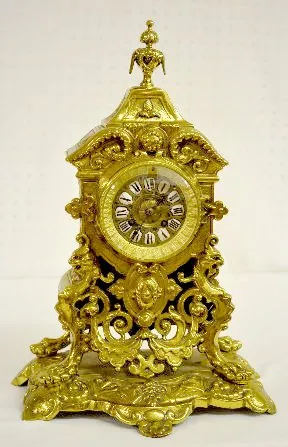 With a bell strike movement No. 3968 and a dial with porcelain Roman Numerals. The case has griffins on each side of the front and open work fleur de lis feet. (The clock is not running at this time. There is no suspension. One spring is wound tight. The "No. I" porcelain piece is missing and a "I" has been painted over the spot where it goes. The VIII at the left keyhole is chipped.) Dial - 4" Diameter; Case - 18" Tall