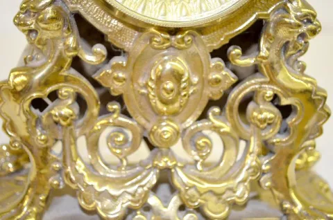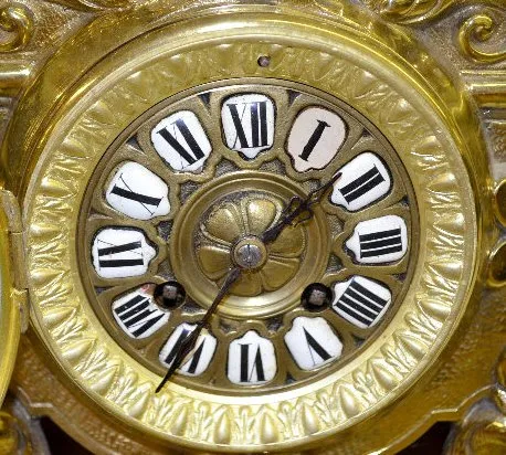 French Bronze Mantel Clock w/Griffins With a bell strike movement No. 3968 and a dial with porcelain Roman Numerals. The case has griffins on each side of the front and open work fleur de lis feet. (The clock is not running at this time. There is no suspension. One spring is wound tight. The "No. I" porcelain piece is missing and a "I" has been painted over the spot where it goes. The VIII at the left keyhole is chipped.) Dial - 4" Diameter; Case - 18" Tall