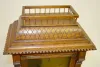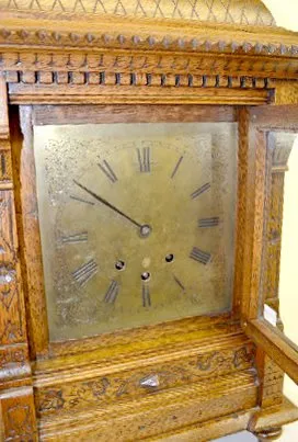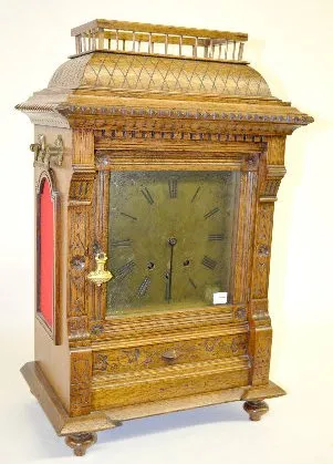 Antique European 8 Bell Bracket Clock With a T&S movement with 8 bells and marked with an hourglass, wing and sickle; an engraved brass face and the pendulum. In a carved oak case with a gallery. Not tested. (There is no key with the clock.) 22 1/2" Tall