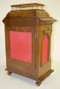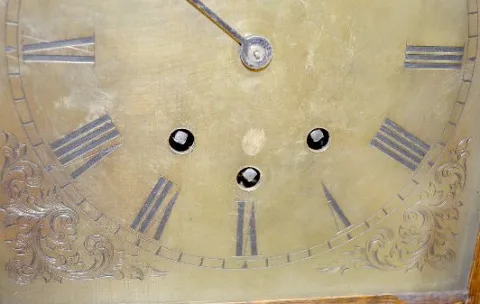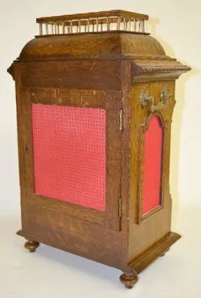With a T&S movement with 8 bells and marked with an hourglass, wing and sickle; an engraved brass face and the pendulum. In a carved oak case with a gallery. Not tested. (There is no key with the clock.) 22 1/2" Tall