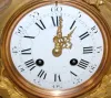 With 1/2 hour bell strike movement, No. 8050, H&F Paris and a porcelain dial with visible date 1867. A cupid like figure is holding a mirror for the lady so she can look at herself. The clock is running and striking at this time. Dial - 4 1/2" Diameter; Case - 28 1/2" Tall x 16" Wide (Other wording on the dial is not decipherable. The statue has been recolored. The metal finish on the base is dirty looking.)