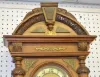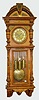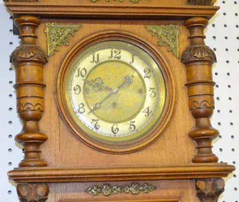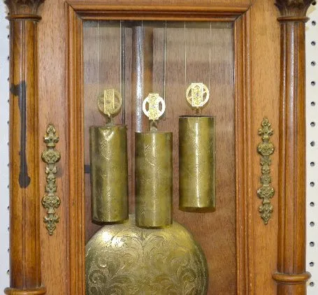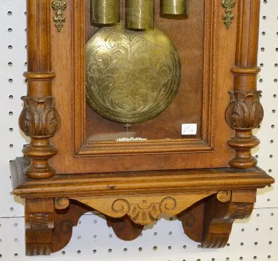With an 8 day with chime movement; an ornate metal dial with the matching pendulum and 3 engraved weights. Not tested. (The top finial is missing.) 46...