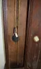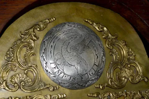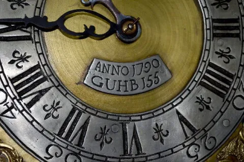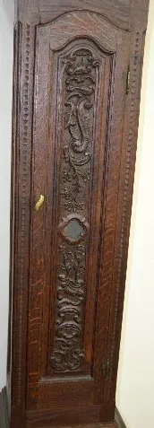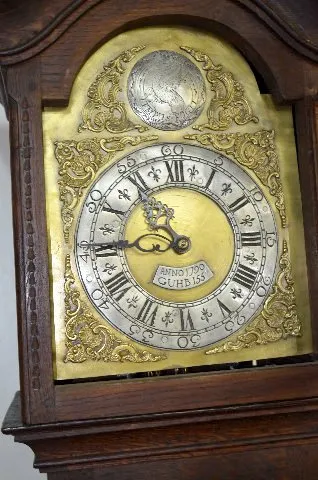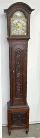 Circa 1790 Oak Tall Case Clock With bell strike and anchor escapement, the movement is described by the appraiser as being continuous chain 30 hour. The dial has an attached label below the hands "Anno 1790 - GUHB155". Above the dial is another player with an engraved eagle and "TEMPUS FUGIT". There are carved designs in the door and base panels of the dark oak case. The joints are all pegged together. The top door has the original staple hinges. The lower door has the original brass hinges of the period. Not tested. Dial - 9"; Case - 93 1/4" Tall