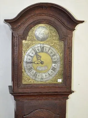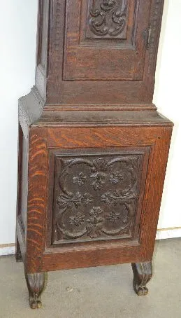 With bell strike and anchor escapement, the movement is described by the appraiser as being continuous chain 30 hour. The dial has an attached label below the hands "Anno 1790 - GUHB155". Above the dial is another player with an engraved eagle and "TEMPUS FUGIT". There are carved designs in the door and base panels of the dark oak case. The joints are all pegged together. The top door has the original staple hinges. The lower door has the original brass hinges of the period. Not tested. Dial - 9"; Case - 93 1/4" Tall