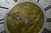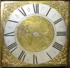 With bell striking movement and a dial with an engraved brass center. George Hewett, the maker's whose name is engraved on the dial, was an early 18th Century clock maker. The plain oak case has the original iron butterfly hinges in the lower door and lock plate. Not tested. Dial - 9"; Case - 72 1/2" Tall