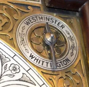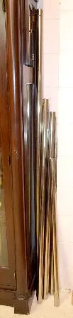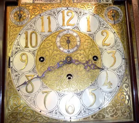 With an ornate signed moon phase dial with seconds bit. Plays Westminster and Whittington chimes; 3 nice brass weights; nine nice chrome tubes; metal ...