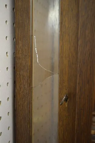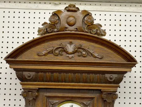 With a porcelain dial, the pendulum and 3 weights. In a heavily carved case with side posts. Not tested. (The weights are dented.) 66" Long