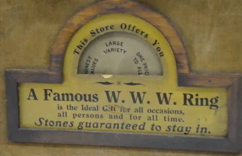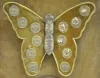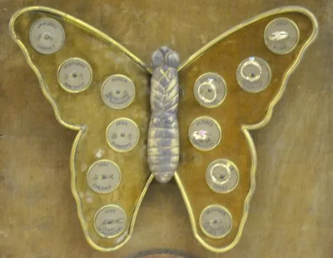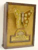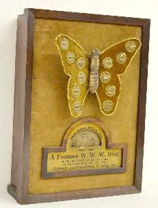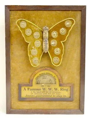 A W.W.W. Guaranteed Ring display with an animated butterfly with disks that show the month and gemstone on the wings. Each disk holds a ring with a gemstone in it. As the wings move, a dial on the bottom of the display turns and reads "This Store has to Offer ,AeP" showing the choices of rings. The winding key is with the piece. (Not working at this time. There are a total of 11 rings - 5 on the display and 6 in a bag - with 1 missing.) 20 1/4" Tall x 14 3/4" Wide