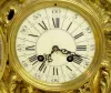 The dial, with Roman Numerals, has a band of Arabic numbers in 5 minute increments around it. The bell striking movement is also numbered 774. The highly polished bronze case is marked on the inside "Cd 331 CD". There is a dragon at the top of the case. The side pieces are 5 cup candelabras. (Although the clock runs and strikes, it quits running after a time - the pendulum may be the wrong length. The dial has 2 dark lines that are beginning to show.) Dial - 4 1/2" Wide; Case - 21 3/4" Tall; Candelabras - 22" Tall