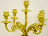 A.D. Mougin Bronze Dragon Clock Garniture Set The dial, with Roman Numerals, has a band of Arabic numbers in 5 minute increments around it. The bell striking movement is also numbered 774. The highly polished bronze case is marked on the inside "Cd 331 CD". There is a dragon at the top of the case. The side pieces are 5 cup candelabras. (Although the clock runs and strikes, it quits running after a time - the pendulum may be the wrong length. The dial has 2 dark lines that are beginning to show.) Dial - 4 1/2" Wide; Case - 21 3/4" Tall; Candelabras - 22" Tall