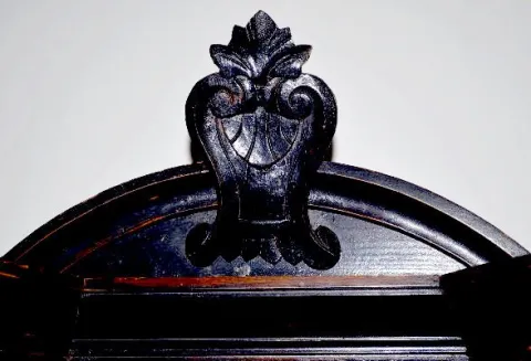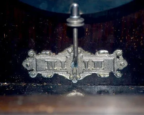 With an 8 day T&S movement; an unmarked porcelain dial with nickel dial surround; 3 silver colored weights; the pendulum and the key. The case has carved column and acanthus leaf sides. Not tested. (There is some wear and rubs to the case and some wood loss on one of the columns.) 50" Long - 43" Long without the crest.