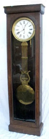 This clock can be a floor or a wall model. There is a full length beveled plate glass door. The clock is running at this time. The pendulum is with the clock. 6'7" Tall x 23" Wide