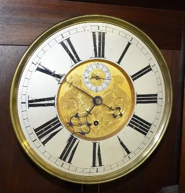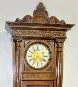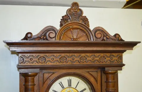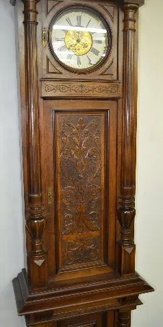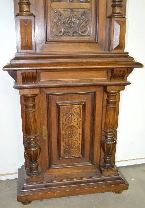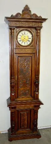 There are engraved griffins in the center of the chapter ring. The tall case has hammered and carved designs along with half columns. Not tested. Chap...