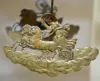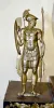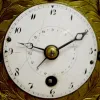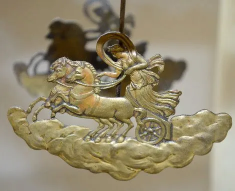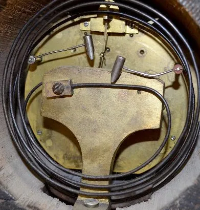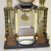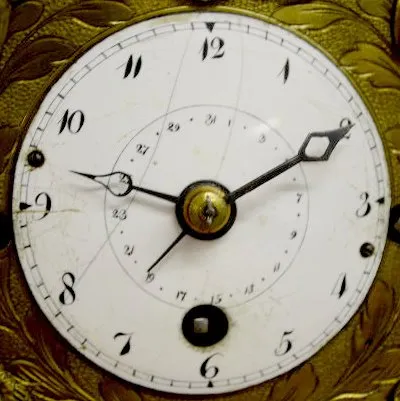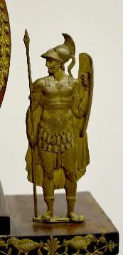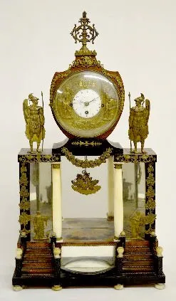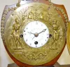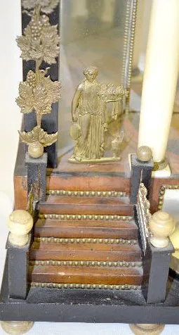 The porcelain dial, with a 24 hour alarm dial in the center, has on each side a Roman Soldier with a hammer held high. On every quarter hour the hammer strikes "X" amount of times. Above the dial is a lion's mask with snakes coming out of the mouth. The back plate of the movement is marked with a joined "HR" which is the only clue as to who made the clock. (Maybe Austrian??) The partly ebonized and painted wooden case has pressed brass figures of soldiers, wine and fruit servers, along with floral garlands, chickens, and strips of grape vines for added decoration. The white alabaster columns form an opening to the stage with mirrors on 3 sides and the pendulum in the form of a chariot with a female driver on clouds. Everything appears to be original. (The springs all wind properly. The two gong strike is off at this time - it needs to be adjusted.) 25" Tall x 14" Wide x 6 1/2" Deep; the Dial is 2 1/2" Diameter.
