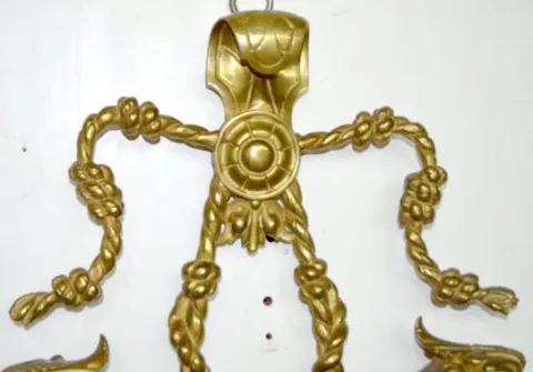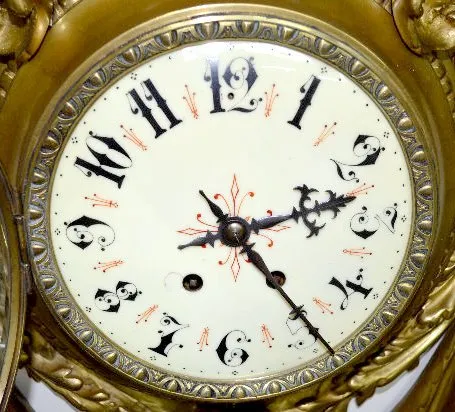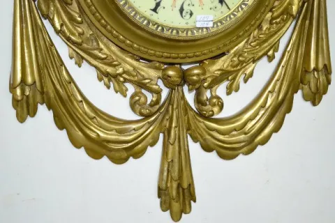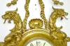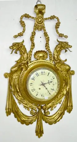 With No. 1075 on the bell strike movement. The bronze case, with a cream colored dial with fancy hands and numbers, has huge griffin or dragon heads at the top on each side, knotted rope, shells and acanthus leaves on it. The clock is complete. (The dial has a bit of damage at one keyhole.) Case - 38" Long