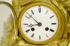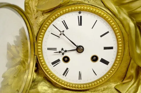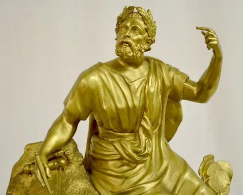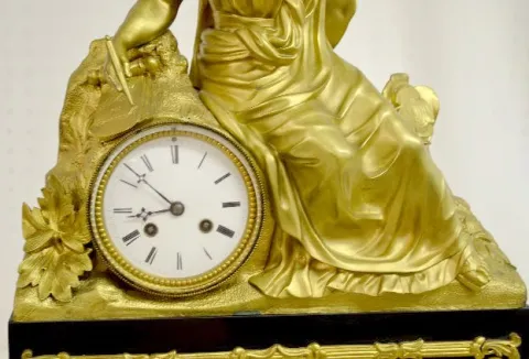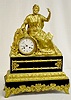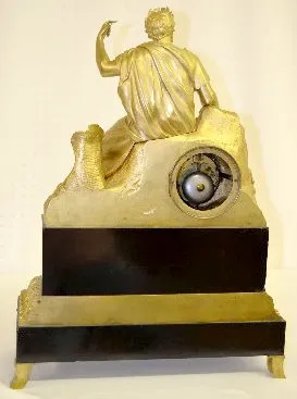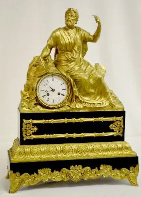 With 1/2 hour bell strike and a porcelain dial. The case, which has staggered layers of slate and bronze, is topped with an ancient scholar. The clock is running and striking at this time. The support on the interior of the case has an unreadable name - Moire(?). Dial - 4" Diameter; Case - 24" Tall x 17 1/2" Wide