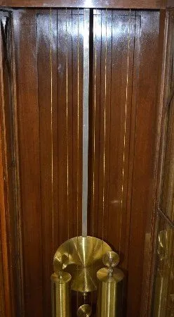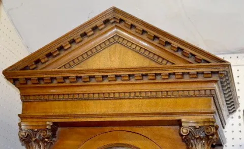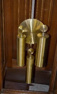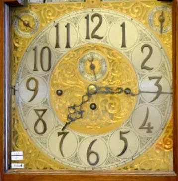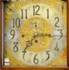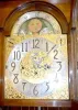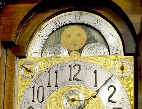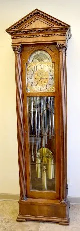 In an ornate mahogany case with an ornate moon phase dial with seconds bit; architectural top. It plays Westminster, Whittington & Canterbury Chimes. The brass weights are with the clock; number 1093; circa 1920. Not tested. (There is minor roughness on one foot.) 96" Tall