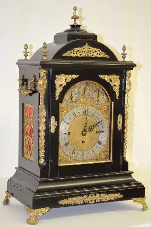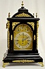 Triple Fusee 8 Bell Musical Bracket Clock With 1/4 hour strike on 8 bells plus hourly on a cathedral gong. In an ebonized wood case with bronze decorations. The clock is running and striking at this time. It is very nice sounding! (There are cracks in the wood around the dial. The veneer on the top of the case is starting to split. The chapter ring and chime control rings are heavily scuffed from use.) Chapter Ring - 7" Diameter; Case - 27" Tall x 17" Wide
