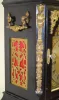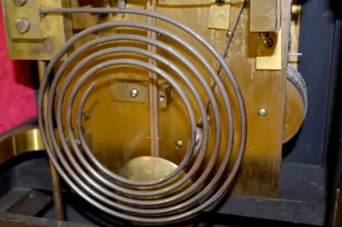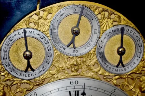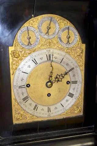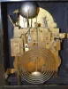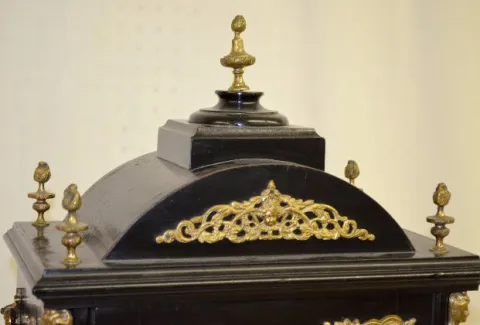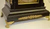 With 1/4 hour strike on 8 bells plus hourly on a cathedral gong. In an ebonized wood case with bronze decorations. The clock is running and striking at this time. It is very nice sounding! (There are cracks in the wood around the dial. The veneer on the top of the case is starting to split. The chapter ring and chime control rings are heavily scuffed from use.) Chapter Ring - 7" Diameter; Case - 27" Tall x 17" Wide