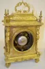 With a T&S movement marked "S. Marti" and incised "LeRolle Fres. Paris" and a brass face with porcelain cartouche numerals and marked "LeRolle Fres. Paris". In a brass case with glass sides; figural lady corners; a brass base with mask and the pendulum. (Although the clock is running at this time, the striking arbor is tightly wound.) 17 3/4" Tall, w/the base.