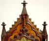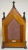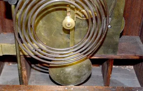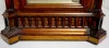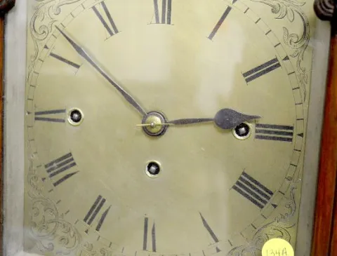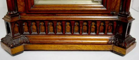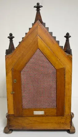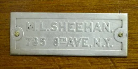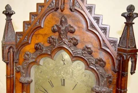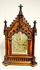 T & S with chime; engraved brass dial; 8 nesting bells; gong strike; brass movement; burled walnut gothic case; has pendulum; no key. Metal tag on the back of the case reads "M.L. Sheehan 785 8th Ave. N.Y." (1/4 hour trip lever end is broken so it will not trip the mechanism.) 30 1/2" x 19" x 11"