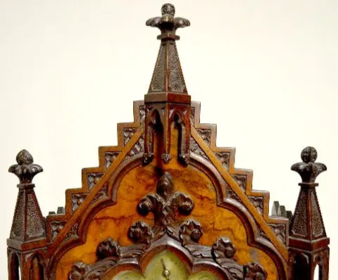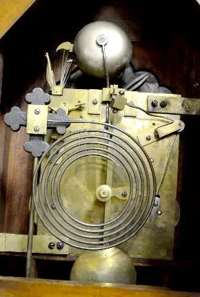 8 Bell Gothic Triple Fusee Bracket Clock T & S with chime; engraved brass dial; 8 nesting bells; gong strike; brass movement; burled walnut gothic case; has pendulum; no key. Metal tag on the back of the case reads "M.L. Sheehan 785 8th Ave. N.Y." (1/4 hour trip lever end is broken so it will not trip the mechanism.) 30 1/2" x 19" x 11"