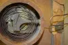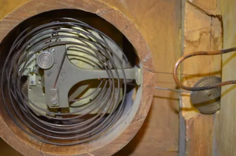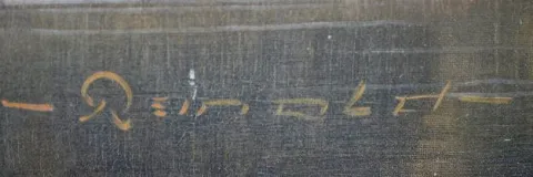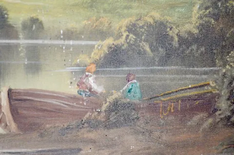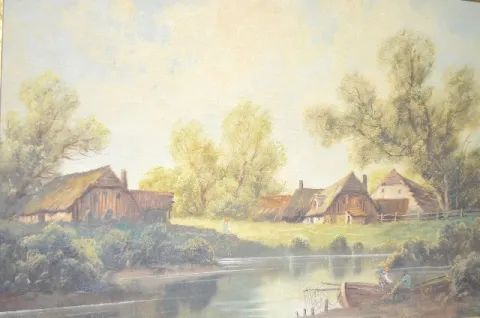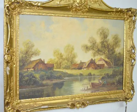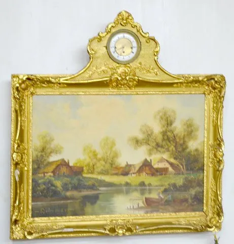 Austrian Picture Frame Clock, Musical w/5" Cylinder With an unmarked movement and a porcelain chapter ring on the dial. The music box has a 5" cylinder and is in working condition. The painted scene of an old farmstead and pond includes several people. The artist name looks like "Renold". The painting is on canvas board. Not tested. (The porcelain chapter ring has multiple hairlines. The frame has some damage.) Dial - 4 1/2" Diameter; Painting - 33" Tall x 32 1/2" Wide