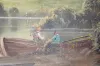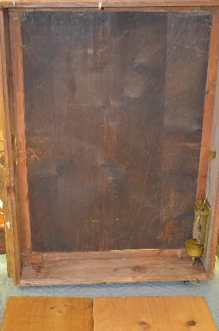 With an unmarked movement and a porcelain chapter ring on the dial. The music box has a 5" cylinder and is in working condition. The painted scene of an old farmstead and pond includes several people. The artist name looks like "Renold". The painting is on canvas board. Not tested. (The porcelain chapter ring has multiple hairlines. The frame has some damage.) Dial - 4 1/2" Diameter; Painting - 33" Tall x 32 1/2" Wide